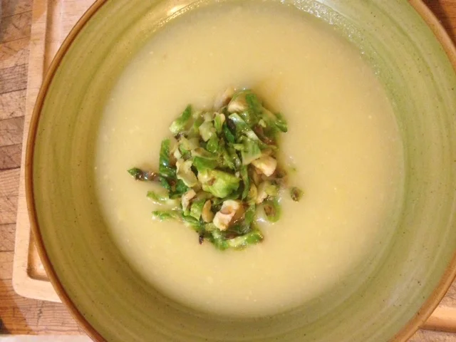 Ladle each serving into a bowl, and top with a spoonful of shallots and brussels sprouts.